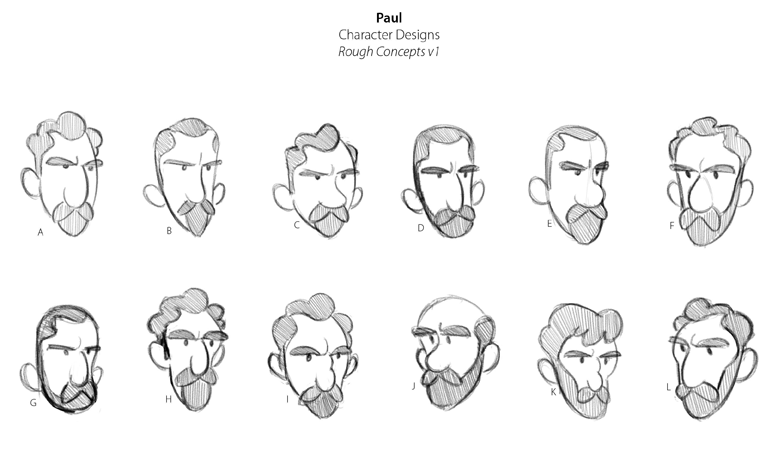 My job was to design Paul. Besides looking like he belonged in the same world as the other characters he had to have a face that could look like an intimidating villain at the beginning of the story and a kindly, likable friend by the end of the story. So it was a bit of a challenge. The client also requested that he have a slender build, dark eyebrows, and a goatie.