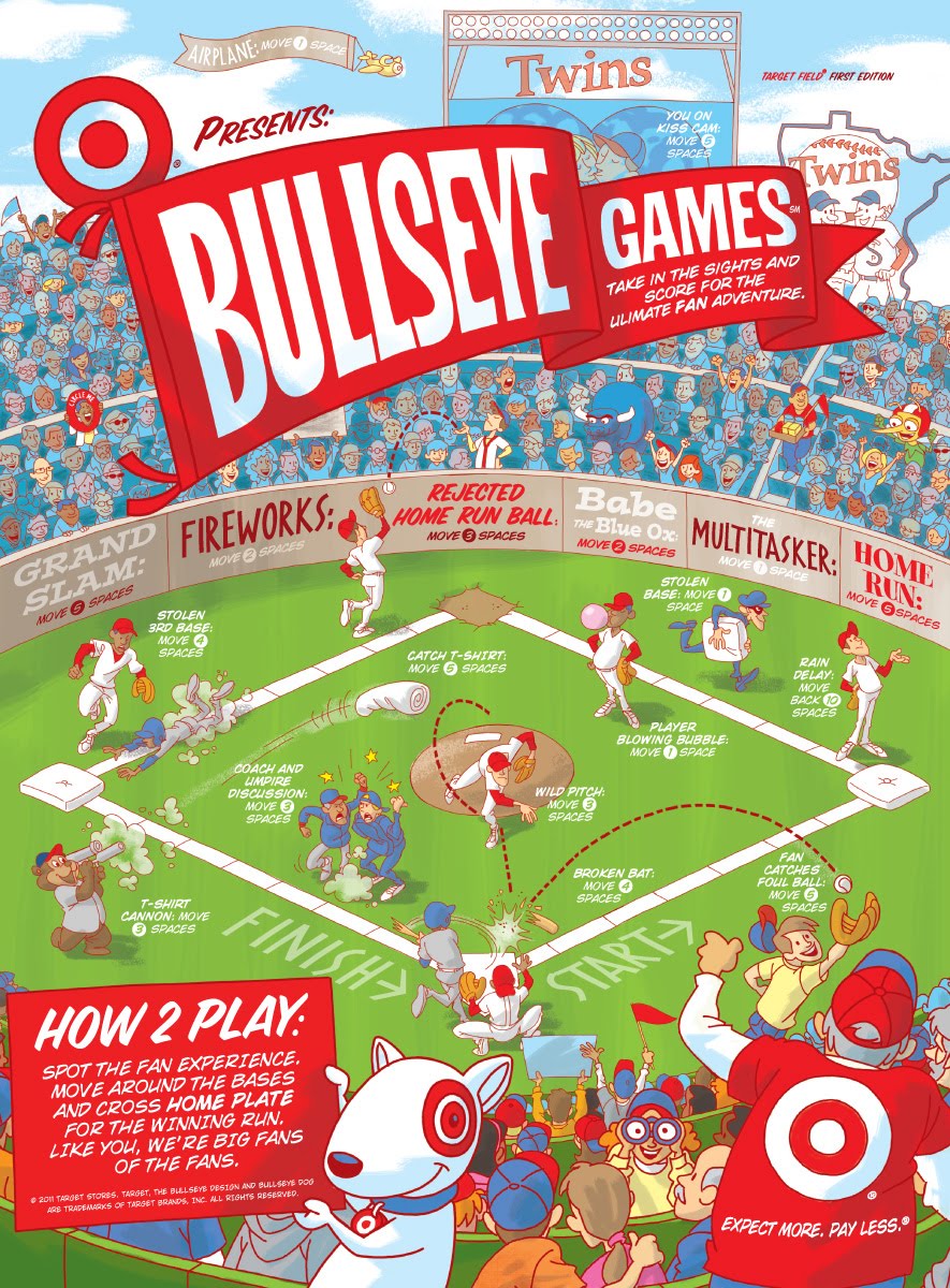 Back in 2011 I was hired by illustrator/designer Sherwin Schwartzrock to assist him with a back-of-the-program ad for Target Field (if you’re as clueless about sports as I am, that’s the Minnesota Twins baseball stadium). We were under a time crunch so he provided me with a rough sketch, I quickly inked it, and then he laid in the color and text. My contribution was actually pretty minimal and so I never even bothered to post it.