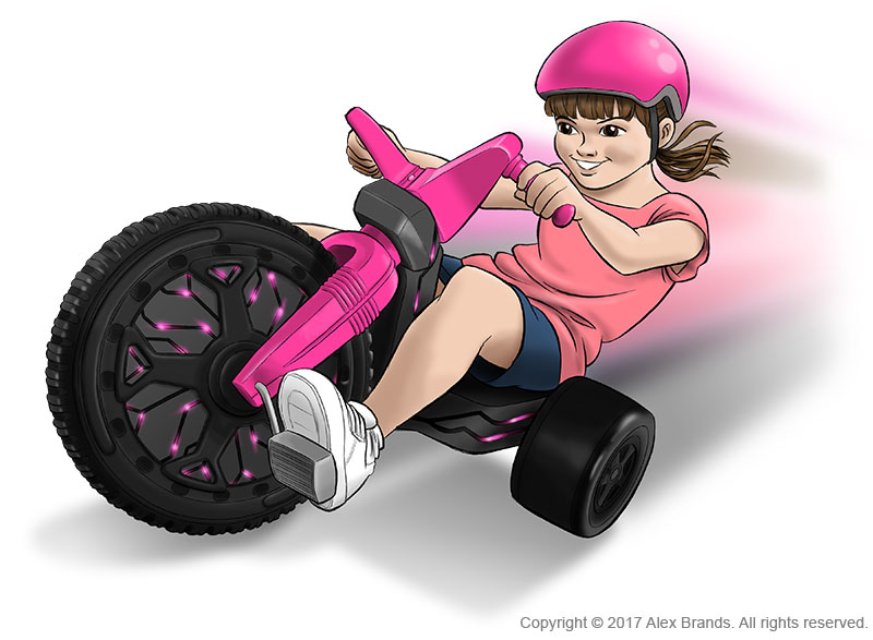 Recently I was hired by Alex Brands to help with the launch of a new line of Big Wheels bikes. They were considering using illustrations for the packaging and asked me to whip up a couple of preliminary concepts of what that might look like (one boy, one girl). Here’s what I submitted (posted with client permission):