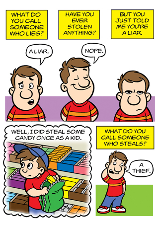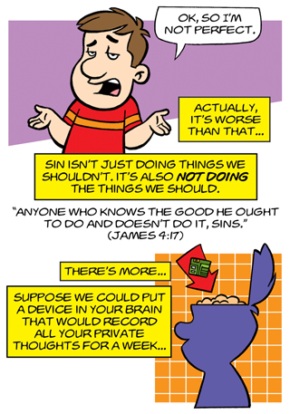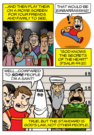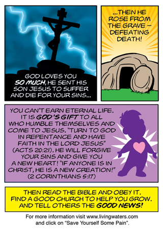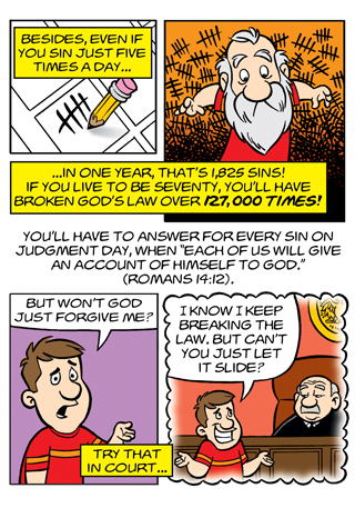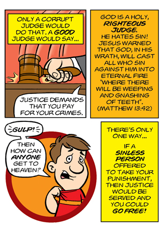 The cartoon below wasn’t really written by me. It’s based on a presentation by Ray Comfort. Printed copies are available through his ministry Living Waters.