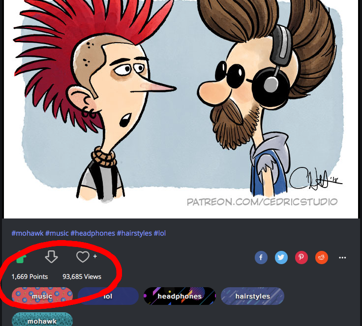 In between client projects I do a webcomic called Sketchbook Silliness. My most recent cartoon (“Mohawk”) was posted on various social media yesterday. I was floored to see that it is zoomed up the charts on both Imgur and Reddit, reaching “Most Viral” on Imgur. After about 24 hours the cartoon finally leveled off at over 93,000 views/1,600 likes on Imgurand 189,000 views/18,600 likes on the Reddit’s “Comics” subreddit. If I add in the totals from other subreddits and misc. social media, it got over 300,000 total views!