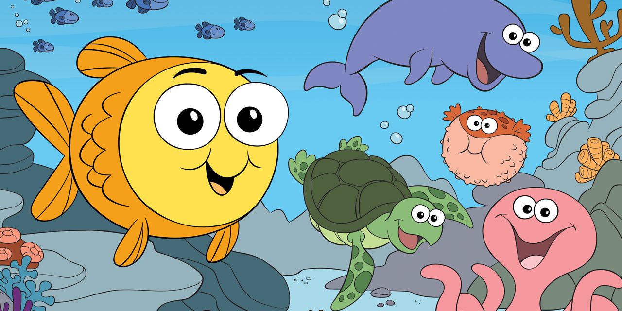 Goldfish Swim School hired me to illustrate a scene featuring their mascot Bubbles (which I had previously designed) with some of his friends. The layout needed to work both as a placemat and also as a cropped image on lunchboxes.