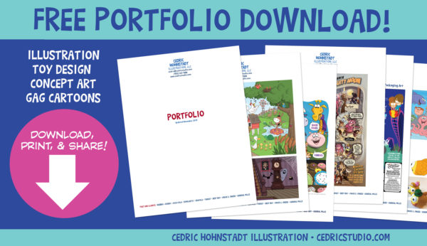 It’s been over a year since I’ve updated my PDF portfolio with a some new samples. This free download contains twelve pages of humorous illustration, toy design, concept art, and webcomics. I’ve included work created for Disney, Hasbro, Cocoa Puffs, GoGurt, and more! Download a copy to keep on file, take to a meeting, or email to a client or colleague.