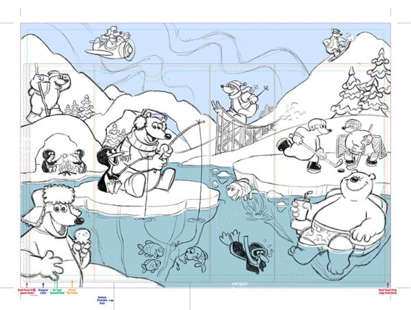Kid Stuff Marketing specializes in kids’ meal menus and toys for restaurants. I’ve done a few projects for them now. Recently they hired me to create a multi-purpose illustration using a line of polar bears that they refer to as “Polar Pranks”. They asked me to take their original polar bear designs and put my own spin on them. They wanted to update the look of the brand while still keeping it somewhat recognizable.