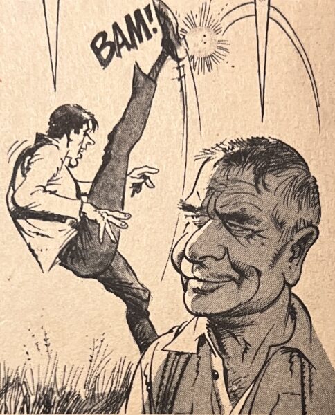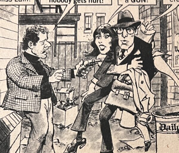 There is nothing wrong with using photo reference in your artwork. The challenge is to not use it as a crutch but instead to put your own spin on it. Instead of just copying what you see you should use the reference as a springboard for something organic and appealing and unique to you. Drucker mastered that skill. He used the photos to get the likeness correct and to approximate the costume and sets, but he wasn’t a slave to the reference. He had a strong enough grasp of anatomy, acting, and humor that he could improvise and add more life and energy to a pose whenever it was needed. He also loved to fill up dead spaces in the frame with tiny throw-away gags. They keep the compositions more visually interesting and help make everything feel more fun.