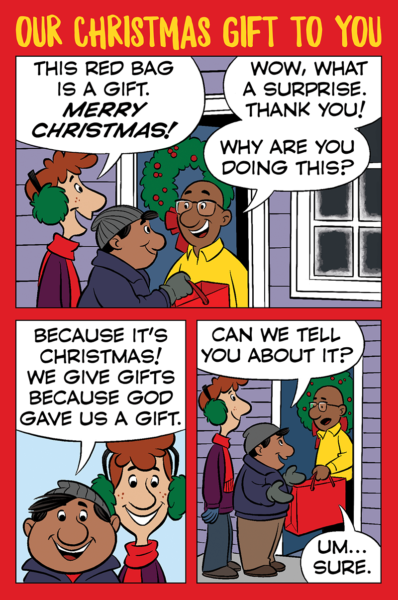 Red Bag Ministry is a Christian ministry based in Pennsylvania. Every year on Christmas Eve teams of volunteers go door to door giving out thousands of red bags containing free food, inspirational gifts, and a Bible. Their goal is to share the love of God and point people to Jesus, no strings attached. They hired me to create a short mini-comic to include in this year’s bags. They gave me a few parameters (for example, they wanted it to start and end with volunteers at someone’s door) and I worked with that.