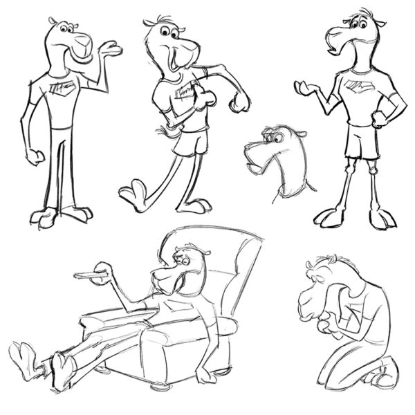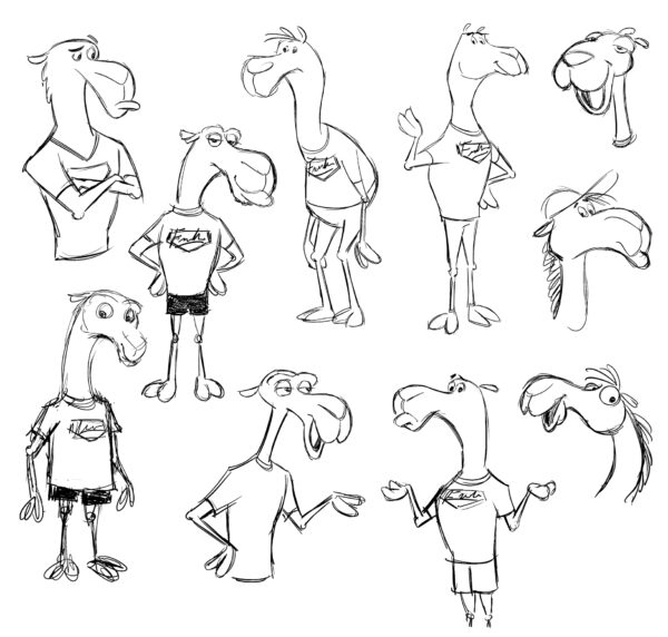 Based on their feedback I worked up some more drawings of the camel character. A camel’s hump looks very weird when you stand him upright so as I drew I kept trying to refine, figuring out how to simplify the essence of a camel without the hump. I also didn’t want something that was too similar to the classic “Joe Camel” cartoon mascot of Camel cigarettes.