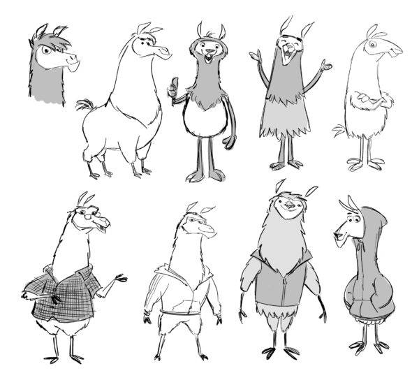 We talked about a llama and a camel. I started with some very rough doodles including some wearing a specific t-shirt that the client wanted. The goal at this stage was just to play around and give them some possible ideas to talk about. Then they told me what they liked, what they didn’t like, and which direction to keep moving:
