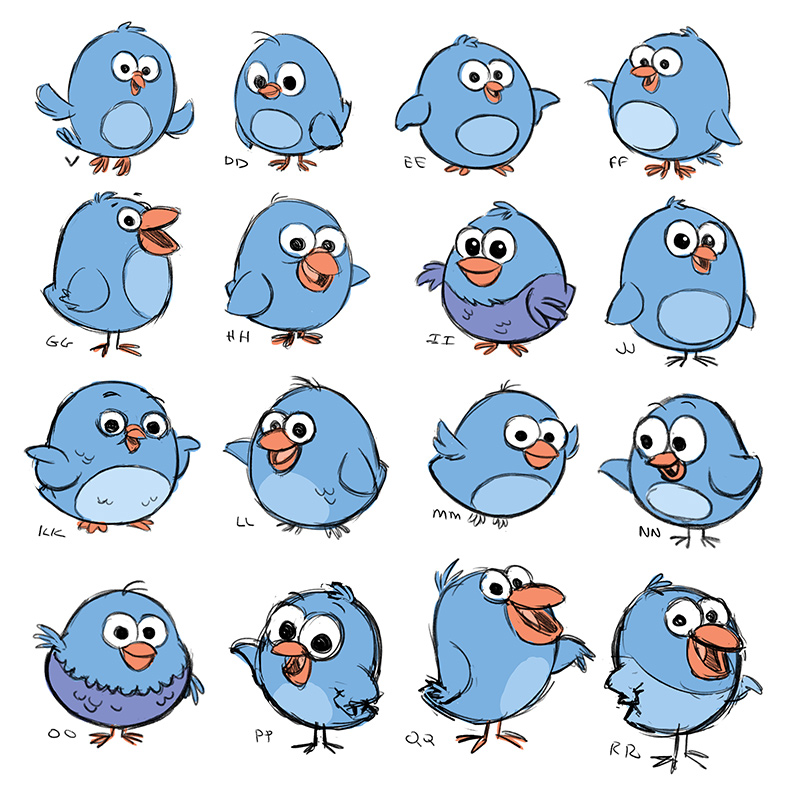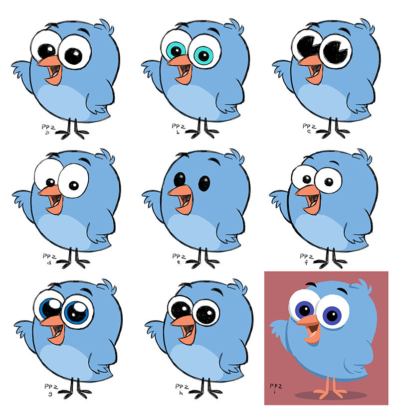 The client really liked the body shape in “PP”. However, with the big head + tiny pointed tail + upside-down tear drop shaped body + the shade of blue, I felt it was starting to feel a lot like a cartoon version of the Twitter logo. Which would look derivative. Also, Twitter has a negative brand association in some people’s minds. Many think of it as a place for arguments and fights and ranting. So I tried adding some stylization to the wings and feathers to help differentiate it from the Twitter bird: