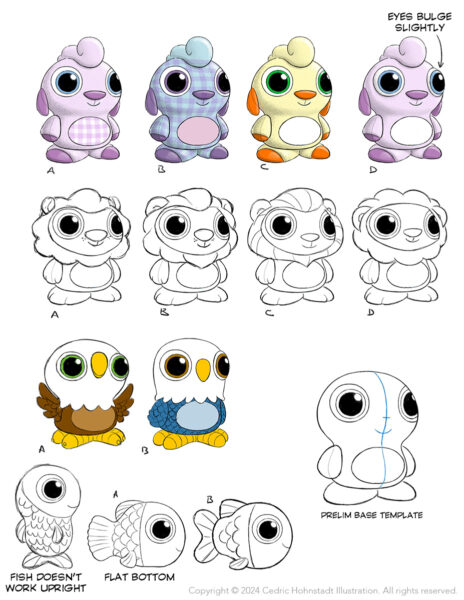 A toy entrepreneur hired me to design a line of toys. We started with a sheep character then refined it into a template they liked. Eventually I sketched up some possibilities for turning that template into a sheep, lion, eagle, and fish: