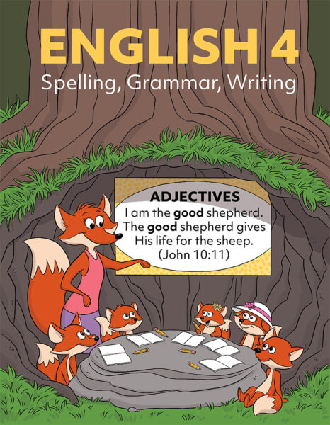 Generations is a Christian homeschool publisher. They hired me to illustrate a series of covers for their English grammar curriculum. They told me what animals to include and what content to feature on the “chalkboard” of each cover, and I took it from there. Learning is always more fun when you have cartoon animals to help out!