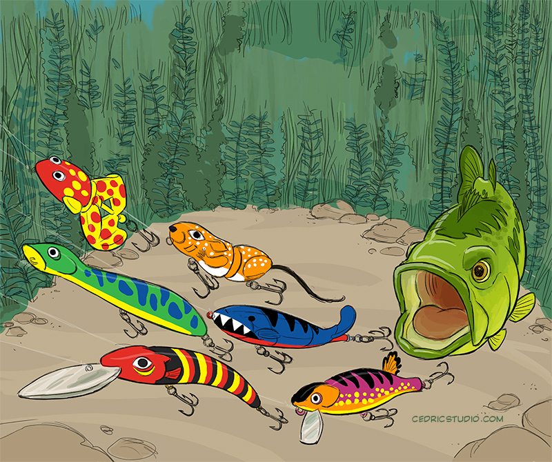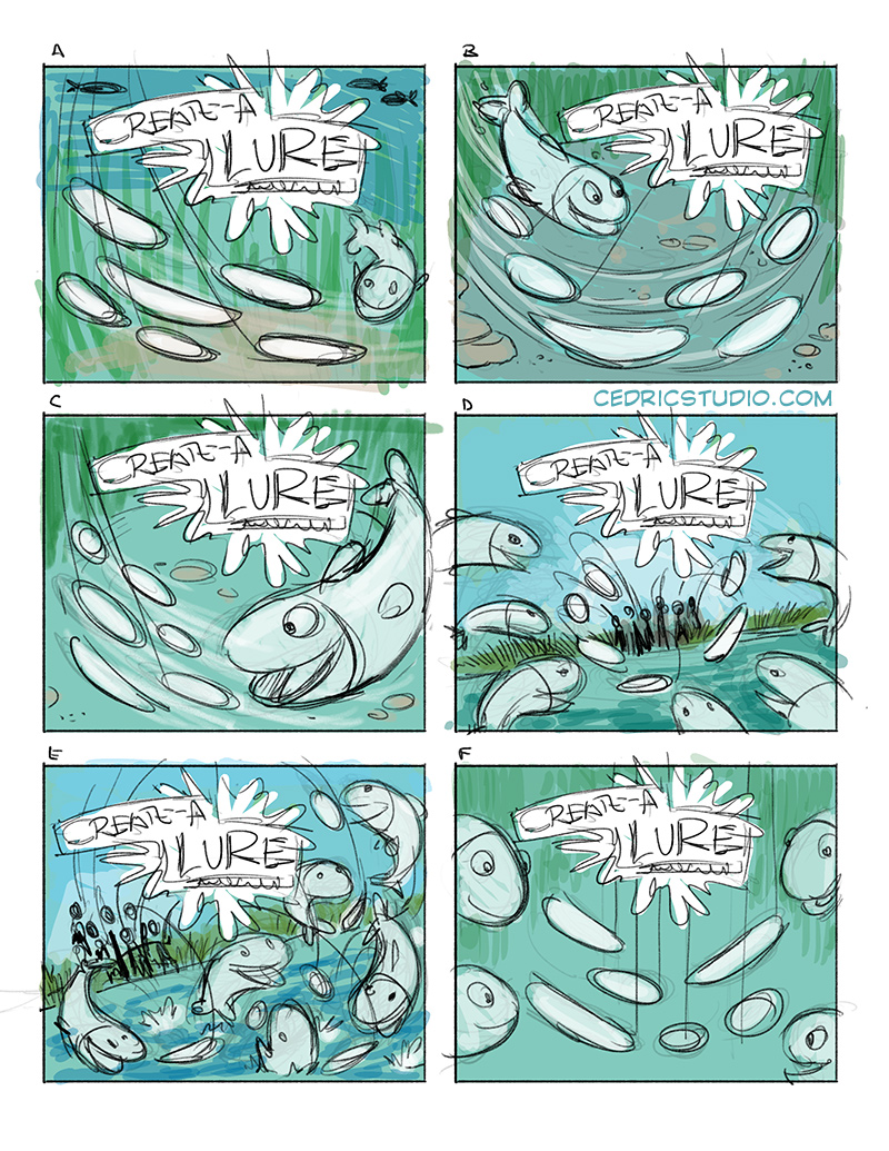 For the first package I was asked to draw a large-mouth bass chasing six different lures, with room for the logo and other text in the upper half. I started with some rough thumbnails playing around with different compositions: