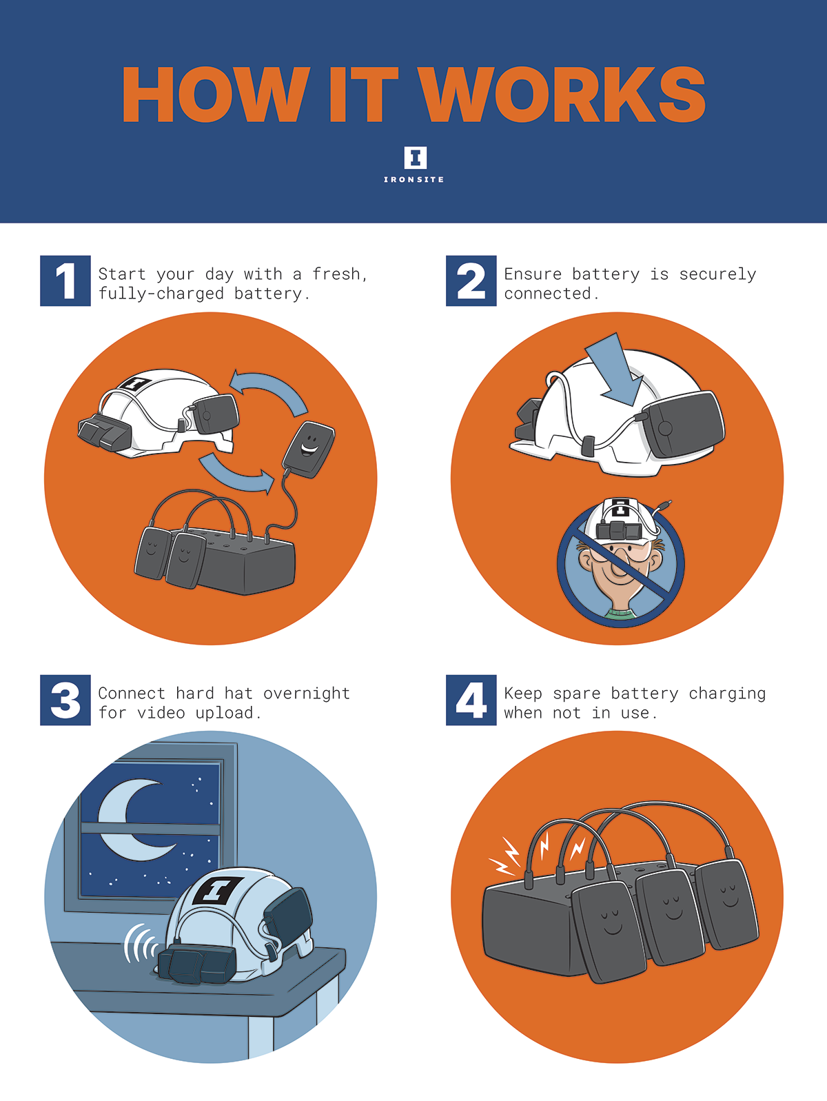 The people at Ironsite wanted to make a simple poster that would explain to the workers how to properly charge and use their cameras. Understandably the workers themselves are not crazy about having everything they do being recorded. (Which I totally get. I don’t think I’d enjoy wearing a camera all day that recorded my every move.) To help counter this, Ironsite thought illustrating the poster in a cartoony style might make it all feel friendlier and less officious. Personally I can see both sides of the argument. I think data gathering is a tool that can be used for good or for evil. The data itself is neutral, it’s all about who controls it and how they use it. I choose to trust that the video footage is only being used to look for ways to make things safer and more efficient, nothing more.