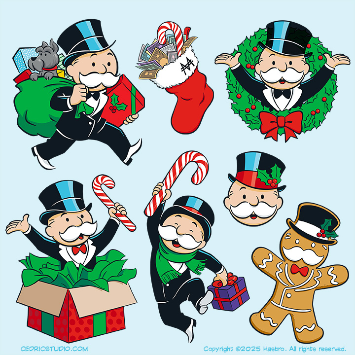 After I designed the updated look for Mr. Monopoly, Hasbro hired me to illustrate him in some Christmas poses. This is a sampling of about thirty holiday-themed poses I drew. I'm not sure what Hasbro will do with them. They may show up on ornaments, or wrapping paper, or socks, or websites...