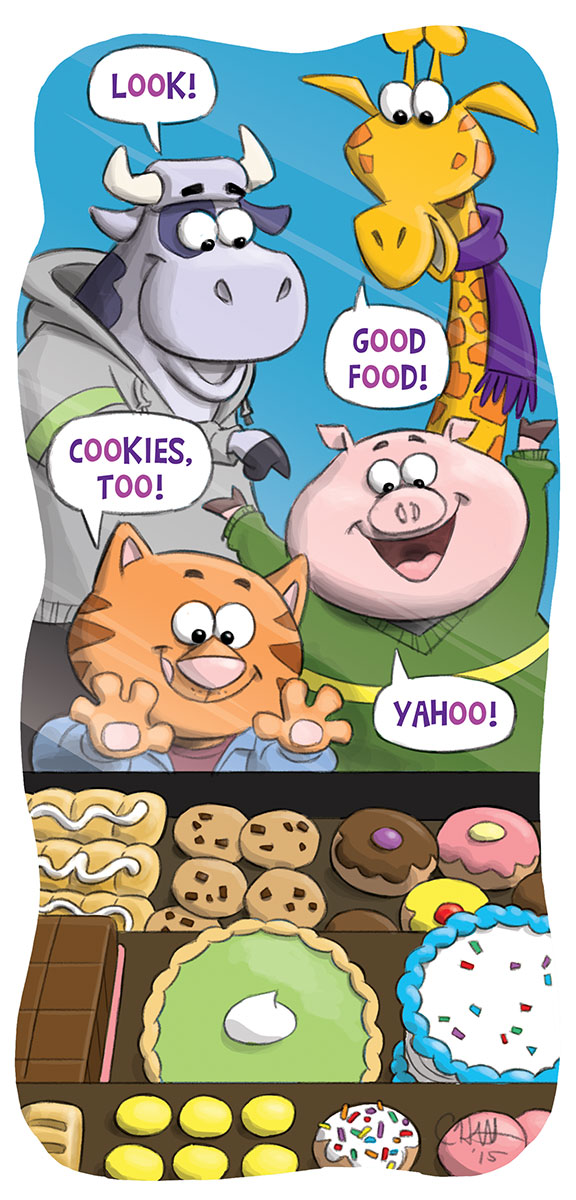 I’ve illustrated packaging for Mr. Potato Head, Cocoa Puffs, Gogurt, Orville Redenbacher, and General Mills’ Monster Cereals. I designed and illustrated the refresh of Mr. Monopoly for Hasbro. I’ve illustrated stories for Scholastic, Cricket Publishing, and Highlights! for Children magazine. My artwork has appeared in ads for Culligan, retail signage for Act II Popcorn, on toys for Hasbro, and on props for the animated series VeggieTales.