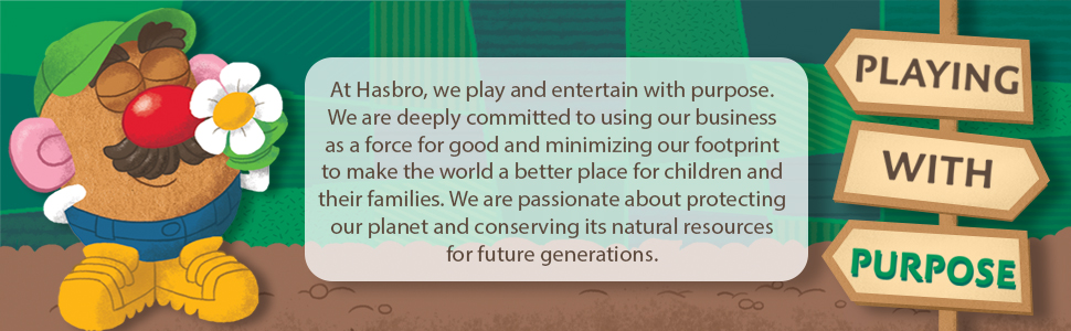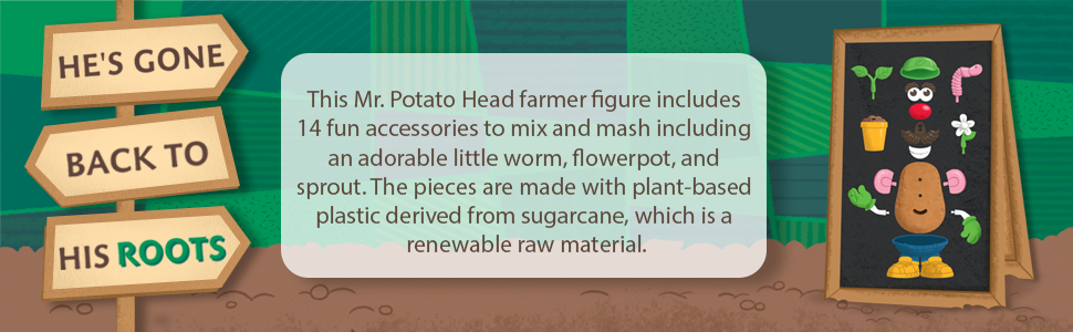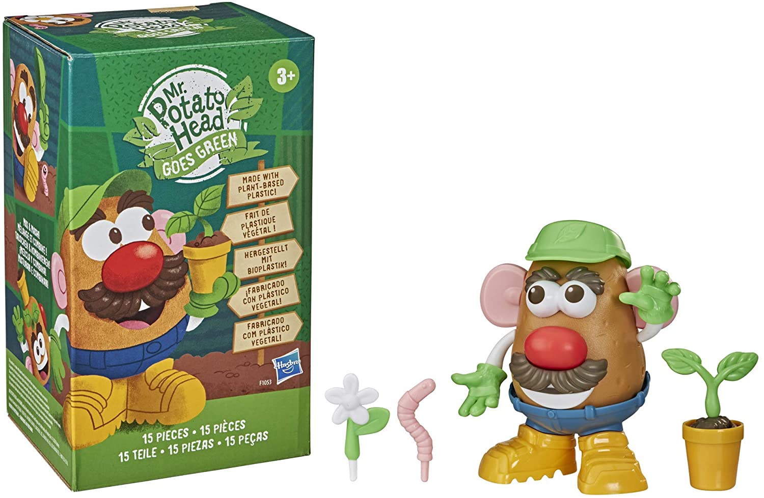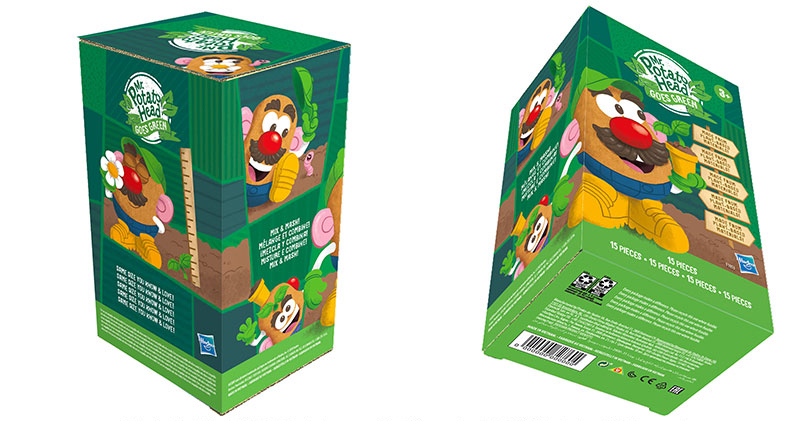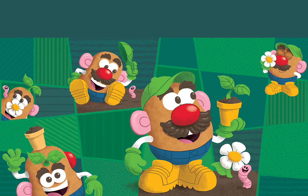 Hasbro hired me to illustrate the packaging for a new toy, Mr. Potato Head Goes Green (Amazon link). It’s a figurine that’s five inches tall, made from plant-based plastic, and ships in packaging that is almost entirely plastic-free. There are fifteen total pieces to swap around and play with.