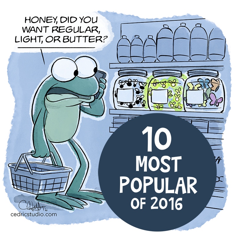 In between client projects I draw silly cartoons for a series I'm calling Sketchbook Silliness. Recently I gave them their own website, SketchbookSilliness.com. According to Google analytics and social media likes/shares, these are my ten most popular cartoons from 2016 (ranked from lowest to highest): 10. 9. 8. 7. 6. 5. 4. 3. 2. 1. More cartoons at SketchbookSilliness.com. [button color="default" link="http://www.sketchbooksilliness.com" size="default" icon_after="caret-right" target="_self" block="false"]View More Cartoons[/button]...